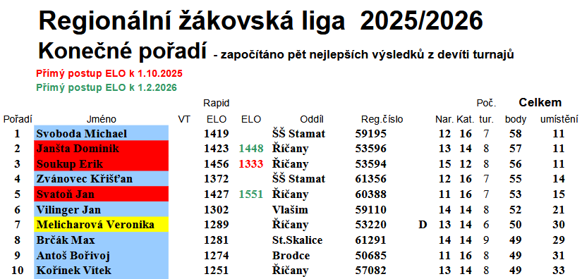 Celkové pořadí, do něhož se všem započítávalo 5 nejlepších výsledků z celé sezony, v rozhodlo také o postupech do krajského finále v kategoriích do 12, 14 a 16 let. Michael Svoboda a Křišťan Zvánovec se ze zlaté a stříbrné příčky kvalifikovali mezi chlapci do 16 let. Přidá se k nim ještě Filip Zahrádka, jenž dosáhl na 4. místo mezi chlapci do 12 let.
